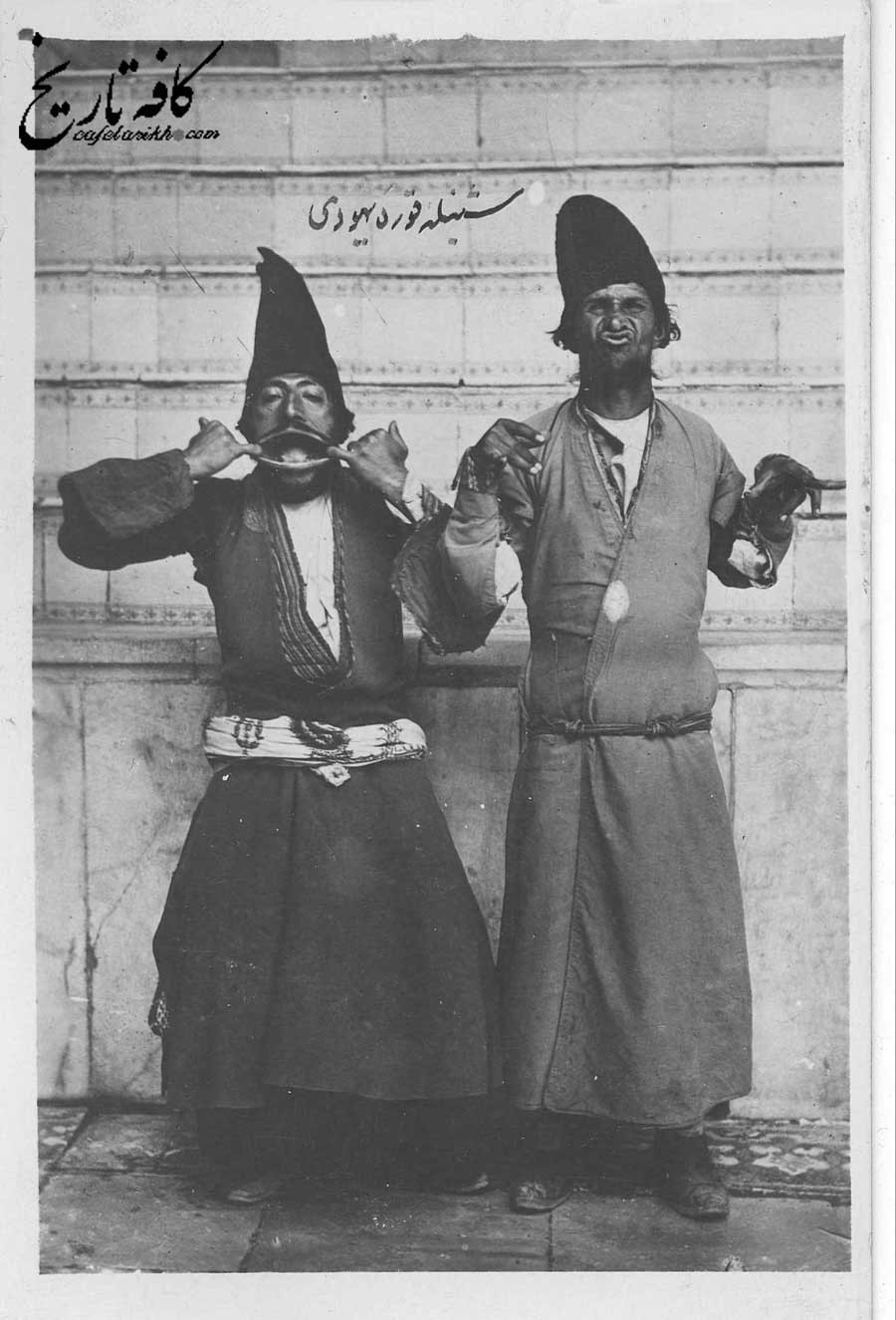 این عکس تاریخی، لحظهای سرگرمکننده از دوره قاجار را به تصویر میکشد که دو دلقک را در حال اجرای نمایش نشان میدهد. یکی از این شخصیتهای کمدی، همانطور که روی عکس نوشته شده، “شنبه قوره یهودی” است که با ژست بامزهای دهان خود را کشیده است. در کنار او، دلقک دیگری با چهرهای خندان و پر از شیطنت ایستاده است. هر دو کلاه بلند و لباسهای سنتی به تن دارند که به سبک آن دوران اشاره دارد. این تصویر نه تنها جنبههای سرگرمی درباری و مردمی قاجار را به نمایش میگذارد، بلکه یادآور بخشی از فرهنگ عامه و هنر کمدی آن دوره نیز هست.